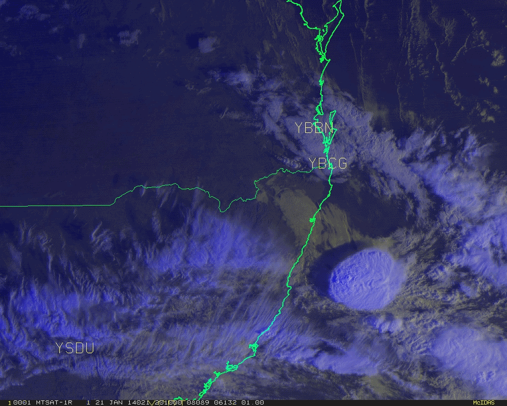 MTSAT-1R 10 minute rapid scan VIS/IR RGB product, southeast Queensland and northeastern New South Wales. Brisbane (YBBN), Coolangatta (YBCG) and Dubbo (YSDU) are annotated.