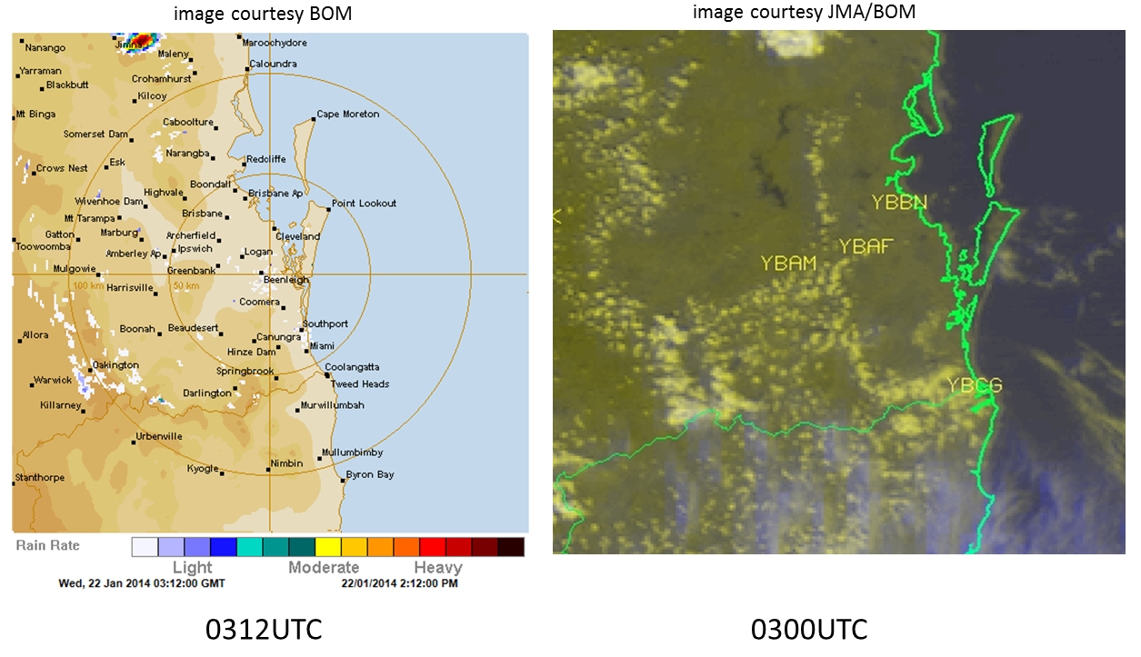 The below images show the RADAR and the corresponding MTSAT-1R rapid scan image just prior to the appearance of the first significant RADAR reflectivity signal from the BoM Brisbane site IDR663 after 03UTC. The actual time is 0318UTC which is when the Forecaster will have received the data (note that there is a delay of 6 minutes in the receipt of the RADAR data and 16 minutes in the receipt of the rapid scan MTSAT-1R satellite data). (radar image courtesy BOM, satellite image courtesy JMA/BOM)