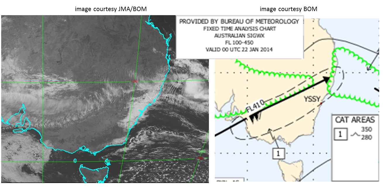 The below images show the 00UTC BNOC SIGWX chart of the 22nd January 2014 of south-eastern Australia with the location of turbulence indicated. Also shown is the MTSAT-1R rapid scan image of the same time. (satellite image courtesy JMA/BOM, SIGWX image courtesy BOM)